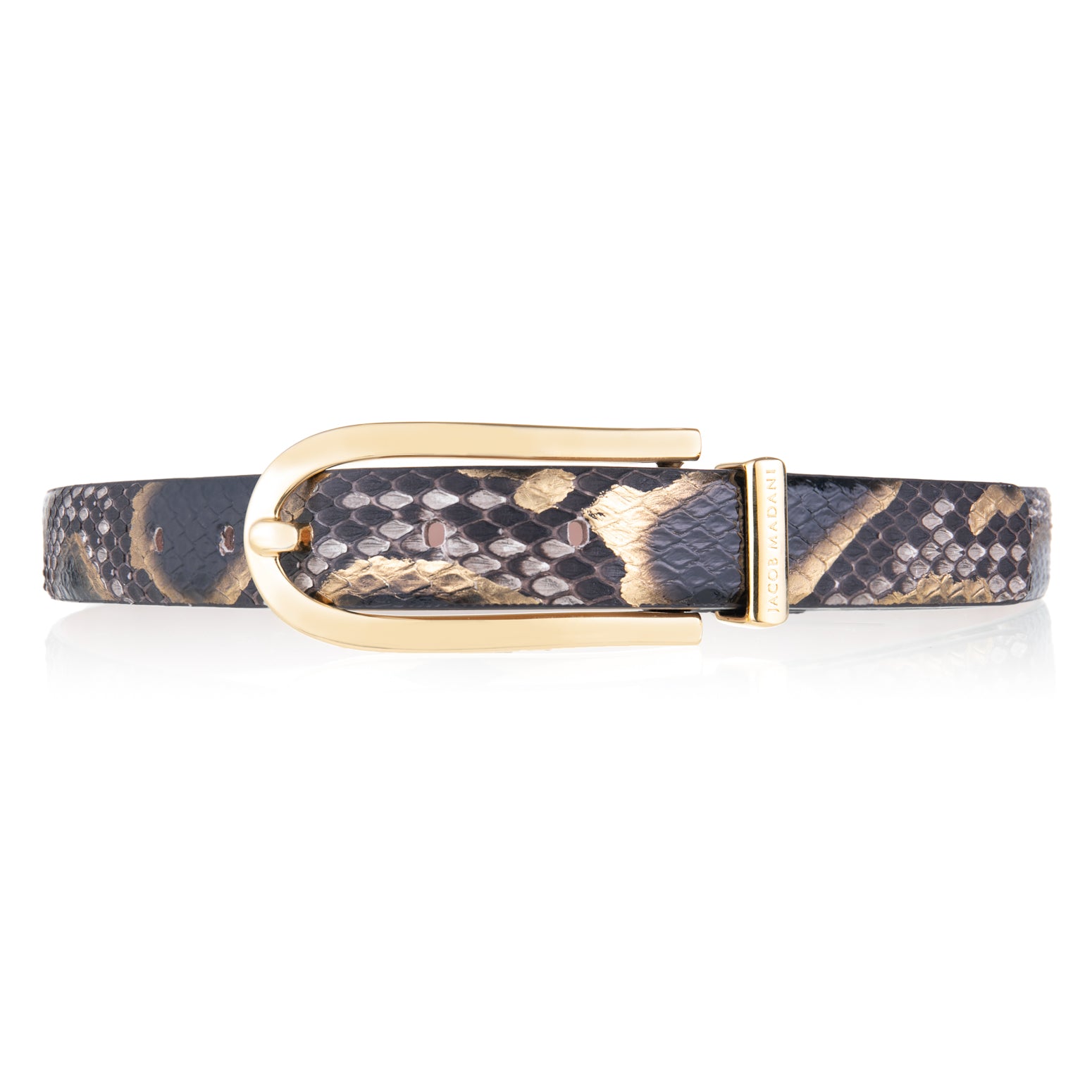 Hand painted python belt in black & gold, featuring push-pin style buckle and branded metal loop in gold finish.