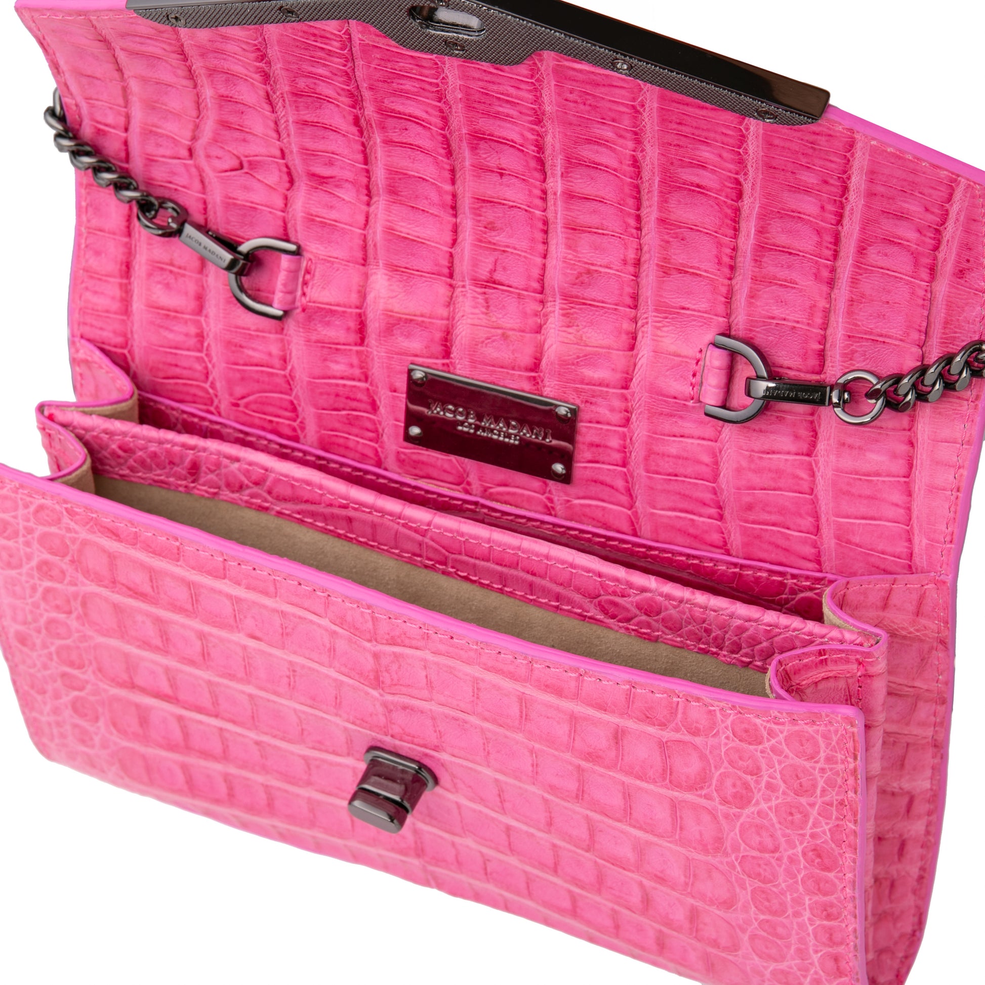Envelope flap clutch in genuine caiman, featuring triangle edge twist lock and long chain shoulder strap.