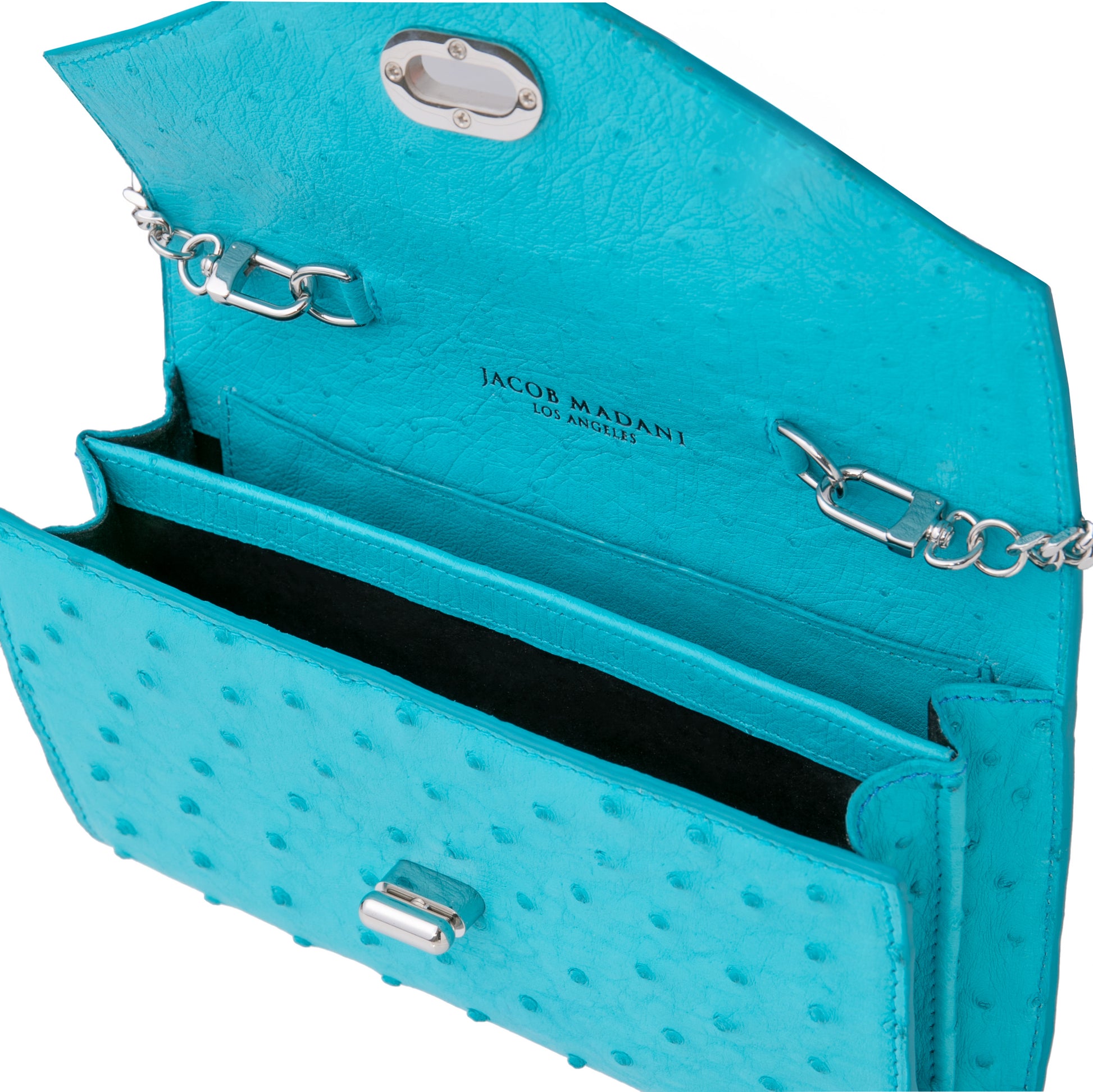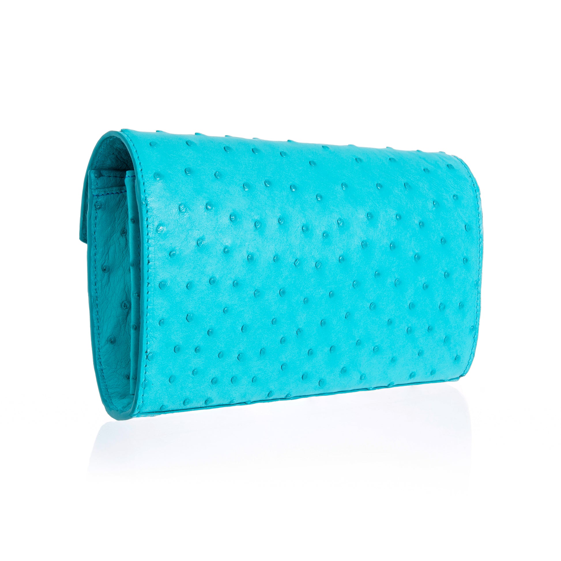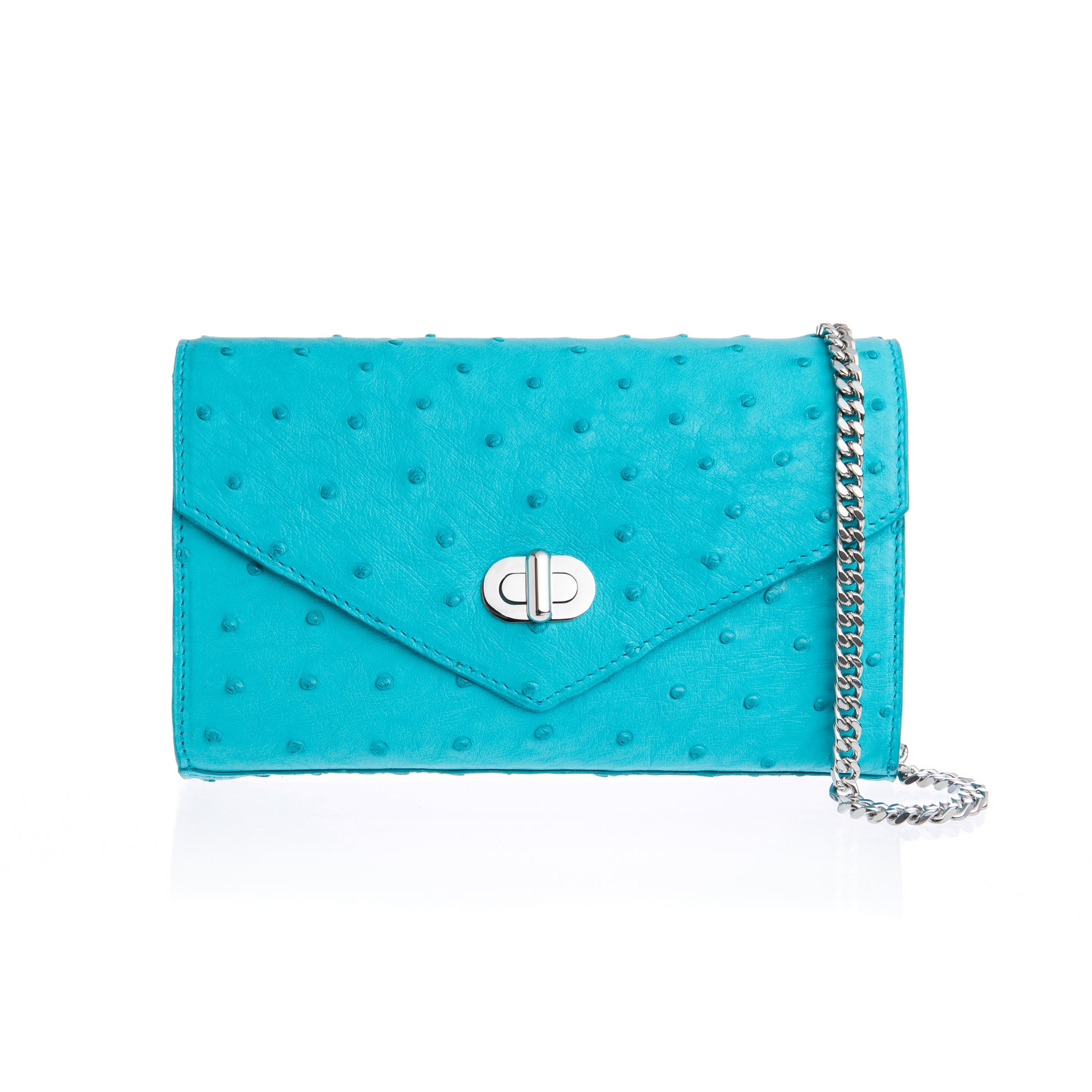 Envelope flap clutch in genuine ostrich, featuring stainless steel twist lock and long chain shoulder strap.