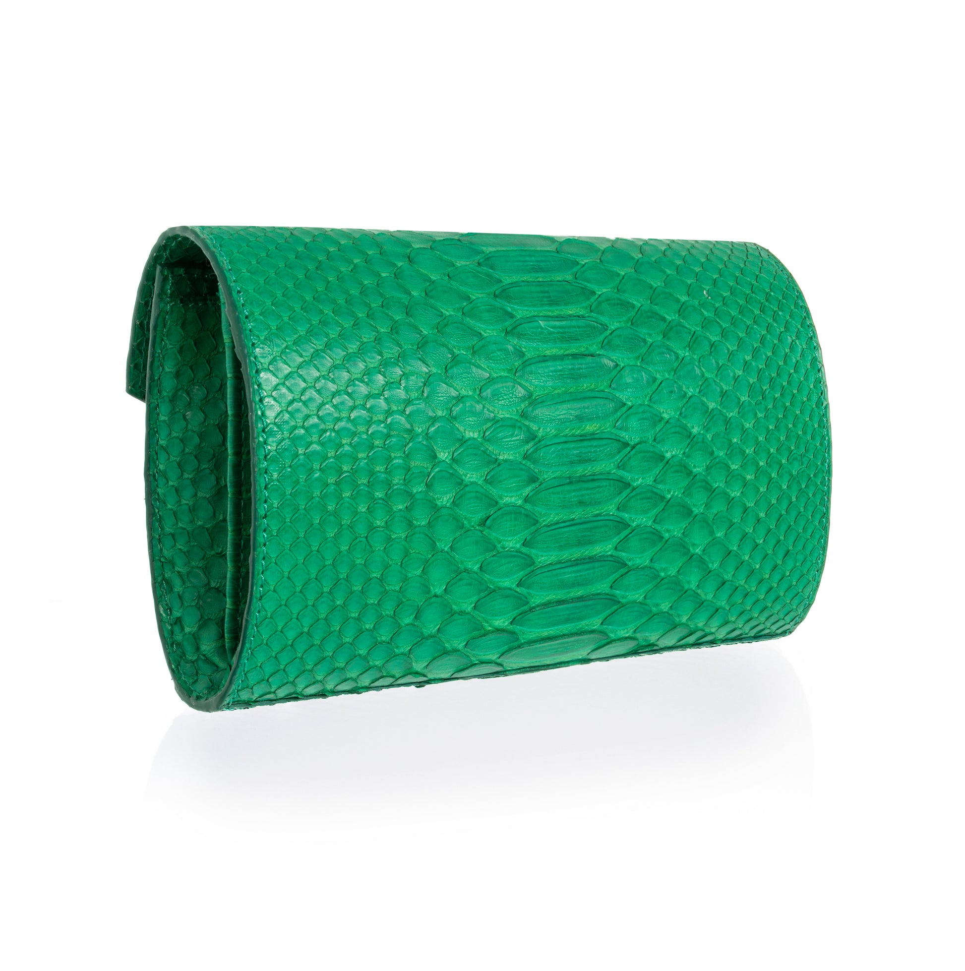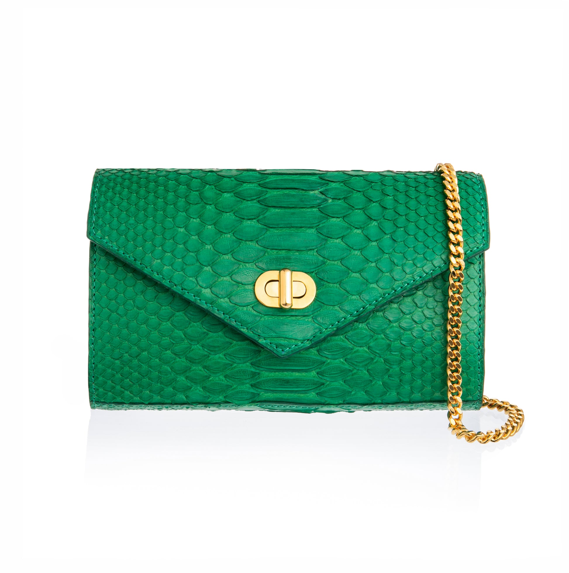 Envelope flap clutch in python, featuring stainless steel twist lock and long chain shoulder strap.