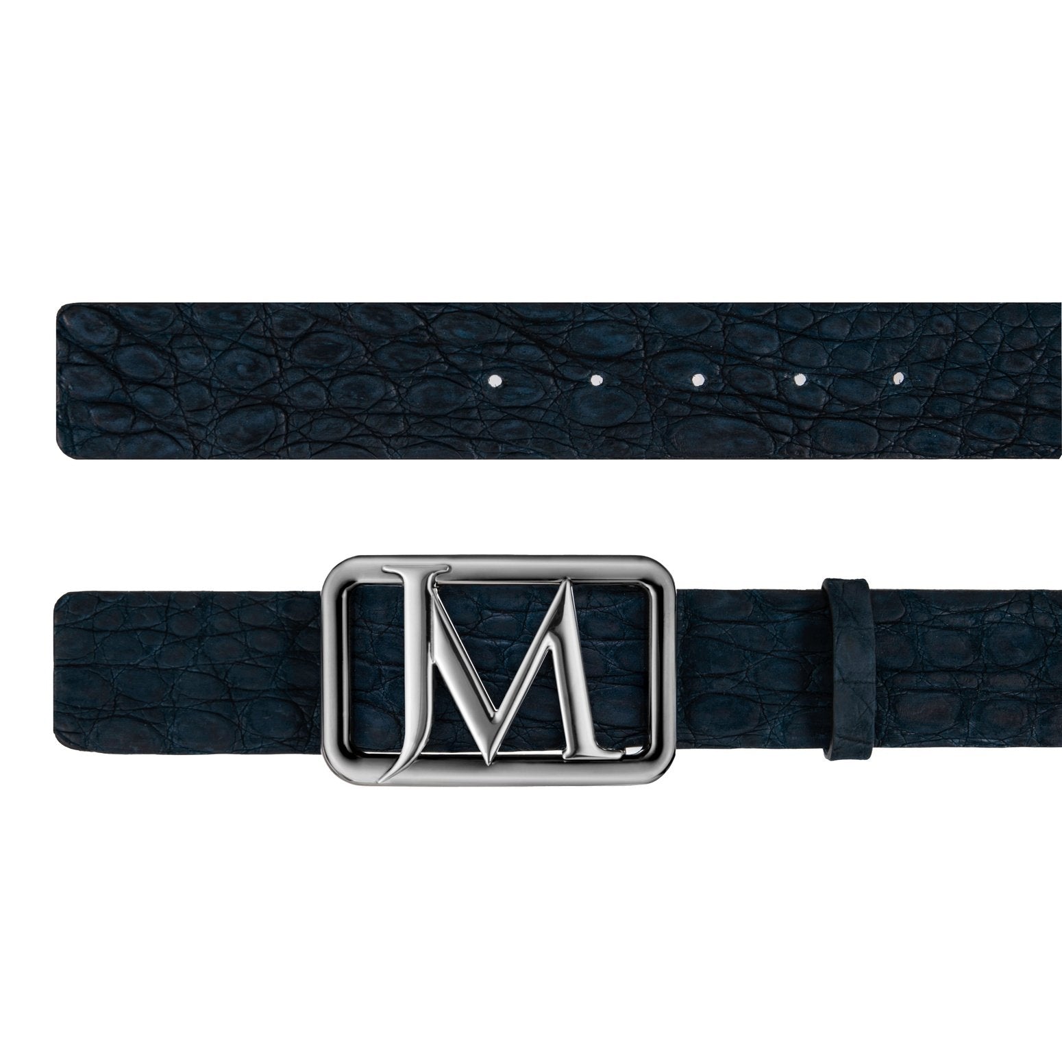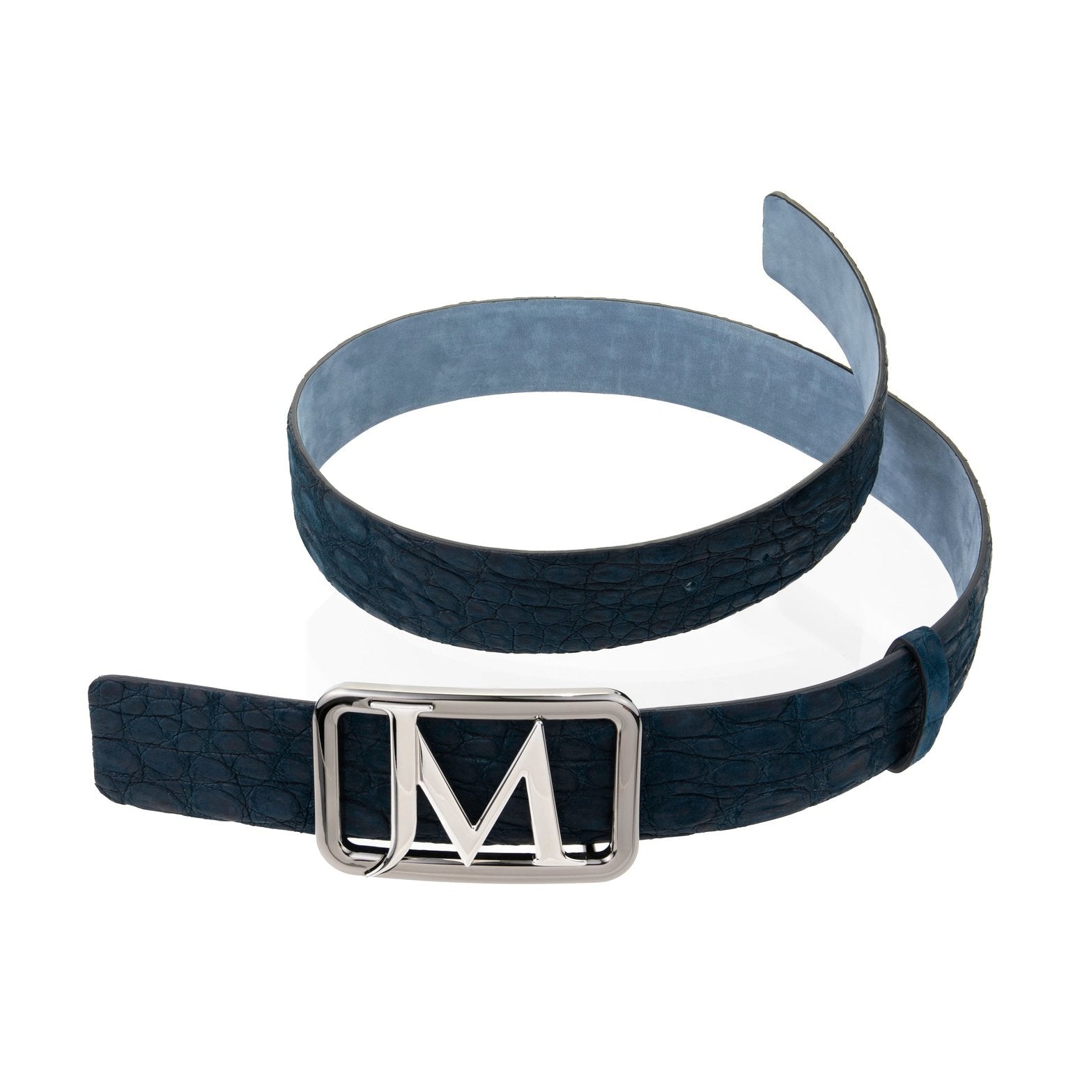 Handcrafted genuine alligator nubuck belt lined with calf nubuck featuring two-tone signature JM buckle.