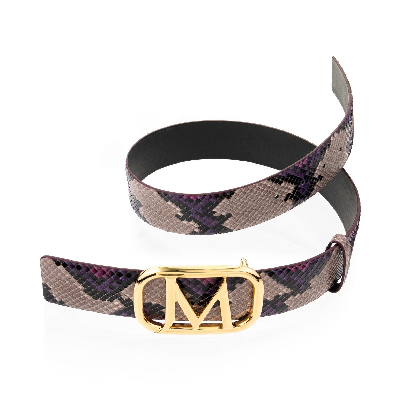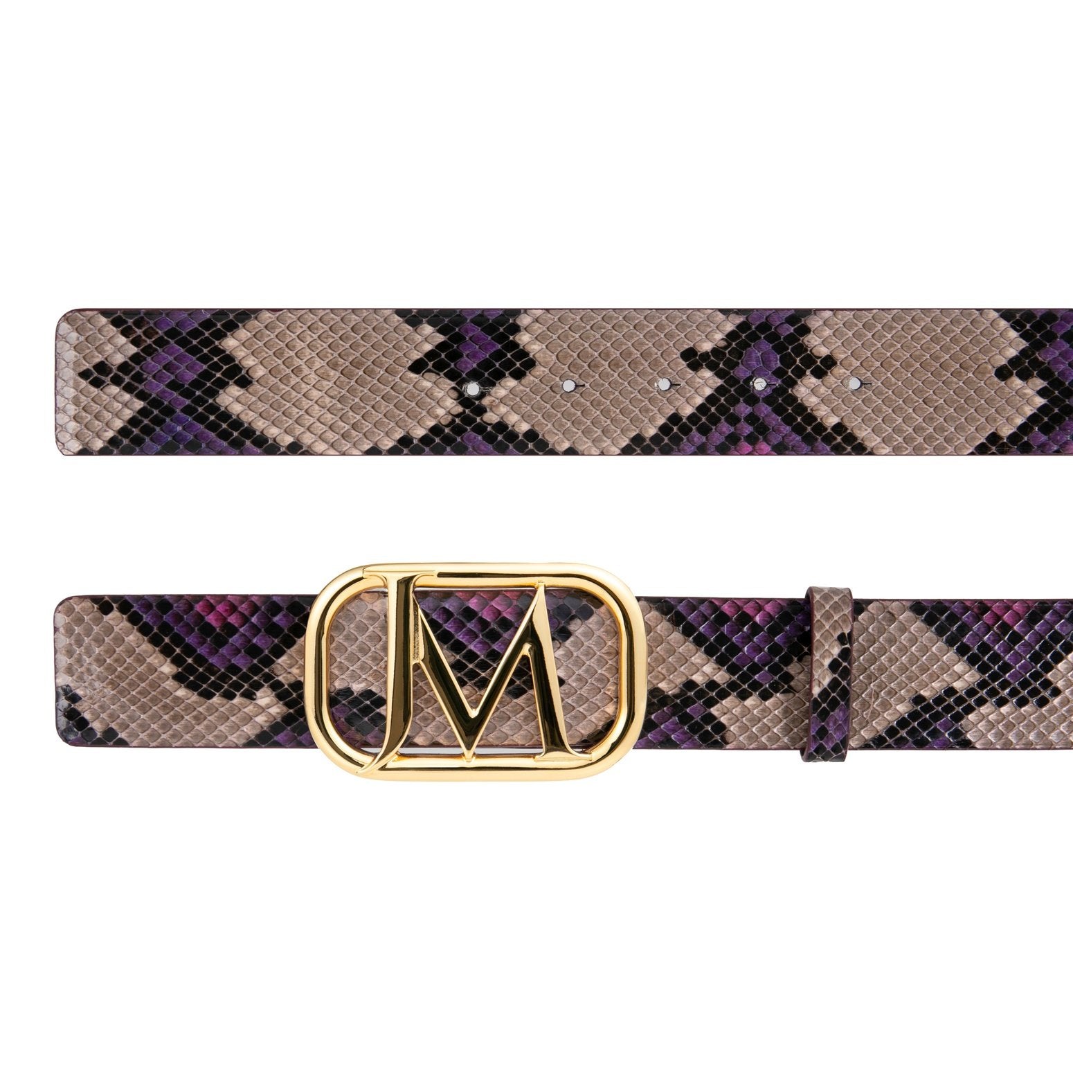 Hand painted Taupe/Violet python belt featuring signature JM buckle in gold finish.