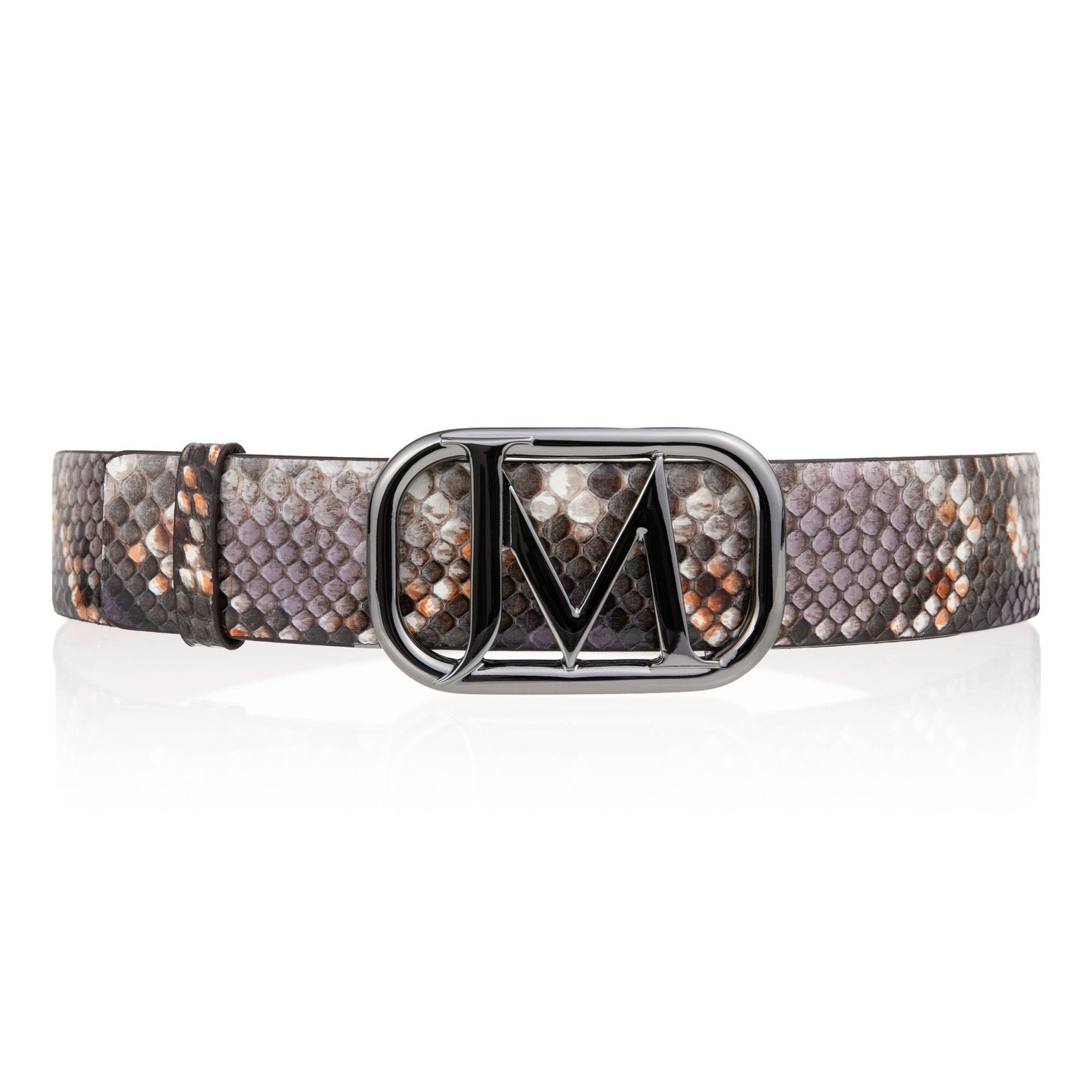 Hand painted Lilac Grey python belt featuring signature JM buckle in gunmetal finish.