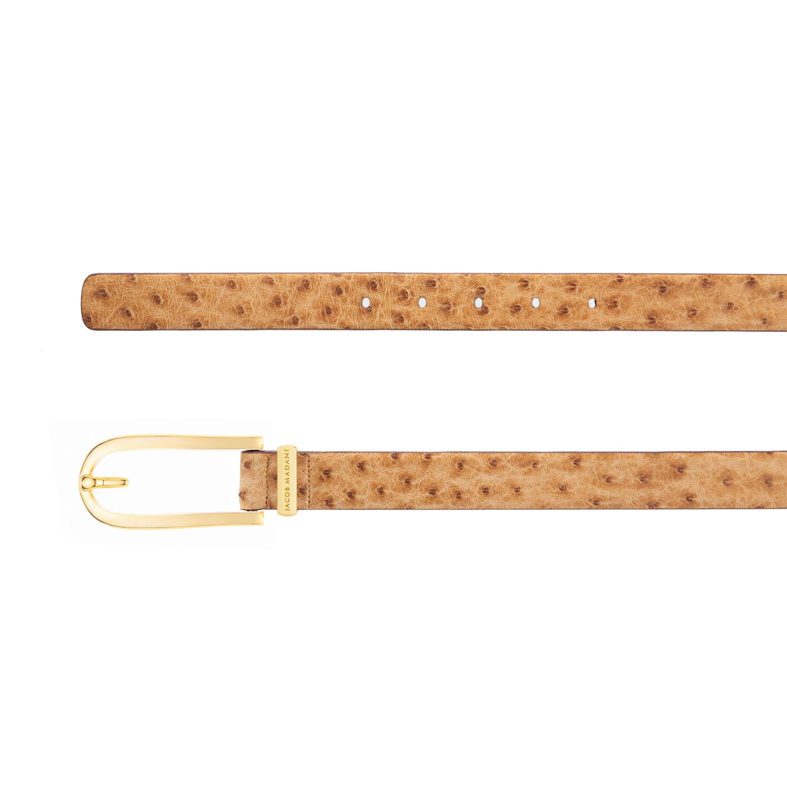 Camel ostrich belt featuring push-pin style buckle and branded metal loop in gold finish.